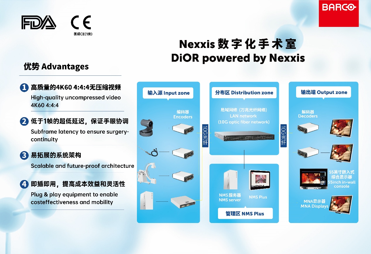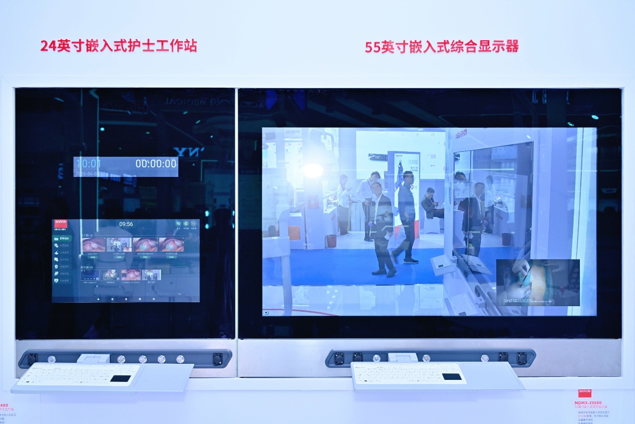巴可24英寸手術室嵌入式工作站 MDMX-22400和55寸手術室嵌入式工作站MDMX-25500在展會上的亮相,成為焦點。兩款工作站均集成了 Nexxis 解碼器,具有強大的術中影像集成管理和控制功能,支持多屏協同工作模式,滿足不同場景對屏幕尺寸的差異化需求,又能為手術團隊提供更寬廣、更清晰的視野。其中,前者采用全高清觸控顯示屏,支持整個手術室工作人員組合和查看多個圖像,輕松便捷;后者屏更大,分辨率更高,可通過WorkSpot 功能實現六分屏,與更能與遠程 PC 視頻源交互,為復雜手術提供跨地域的會診支持。