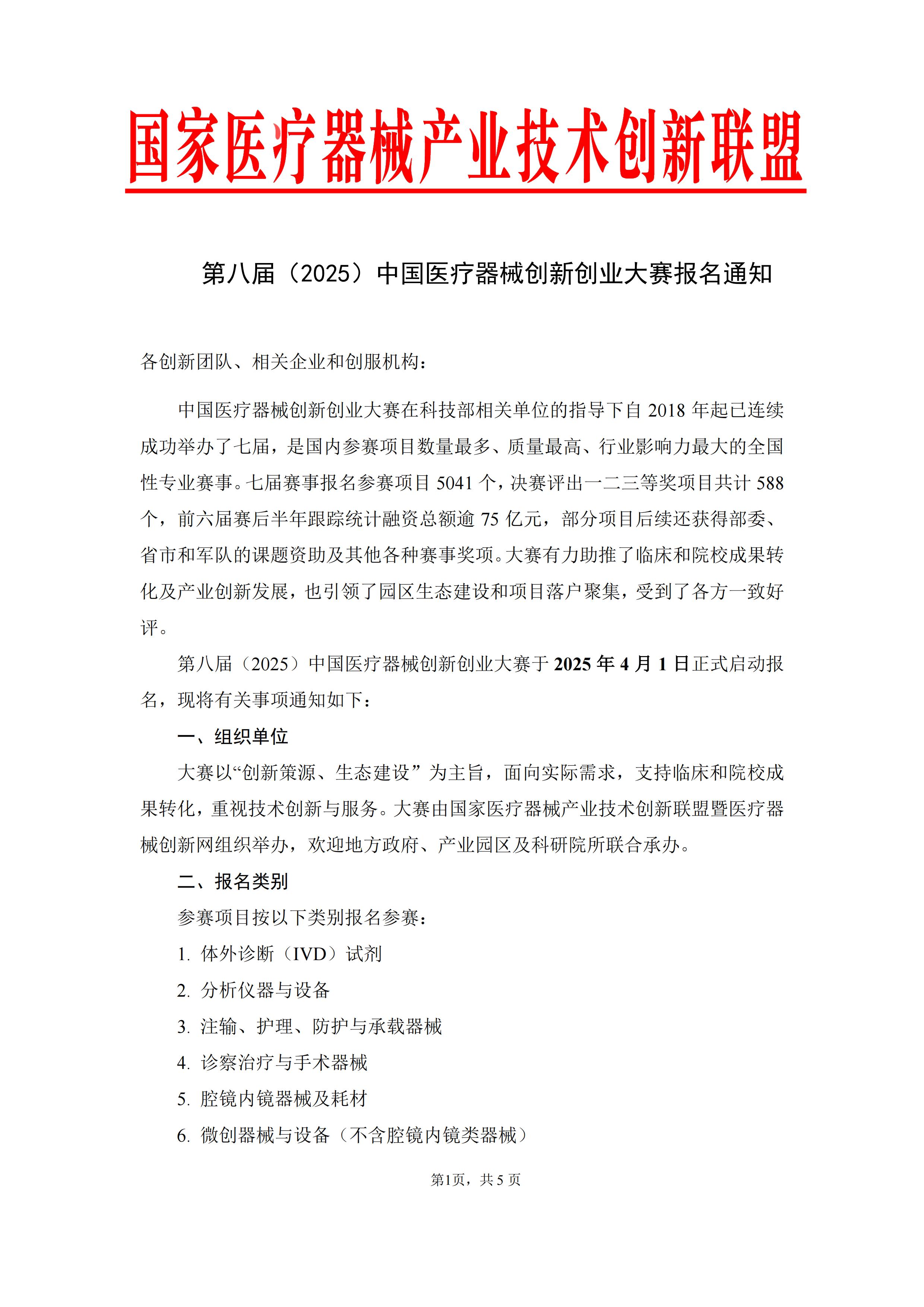第八屆(2025)中國醫療器械創新網創業大賽于2025年4月1日正式啟動報名,現將有關事項通知如下: