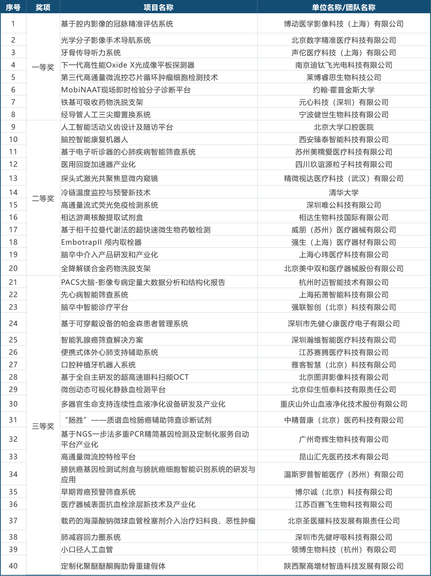 第二屆(2019)中國醫療器械創新網創業大賽決賽獲獎名單